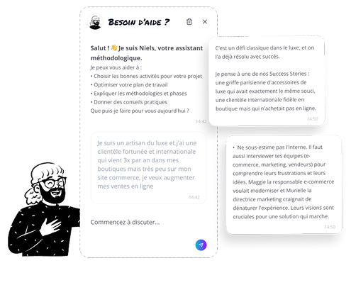 The AI assistant sits inside that workspace, context-aware, trained on the method. When a team hits a decision point, it doesn't redirect them to a knowledge base. It meets them where they are.